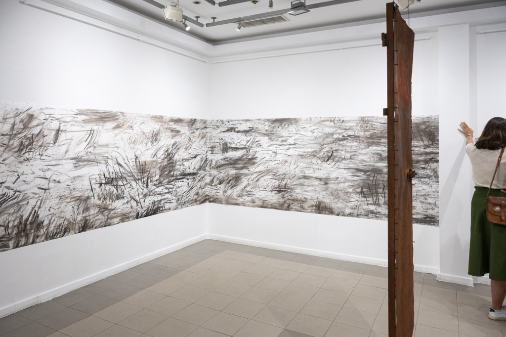 charred wood pieces, a burnt metal door from a bird-watching tower, 600x125 cm drawing made with charred wood collected in 2024 from the Dragoman Marsh.