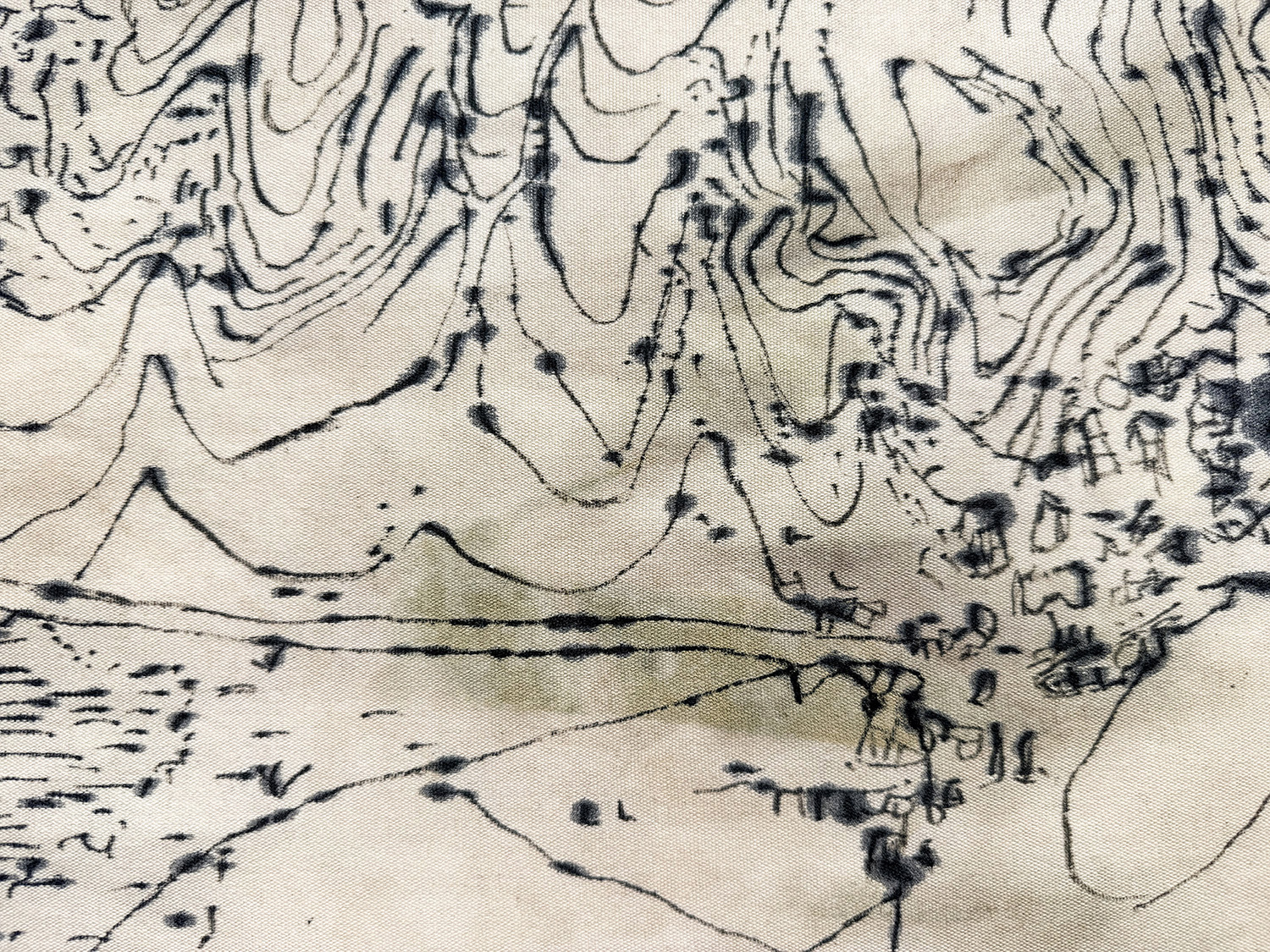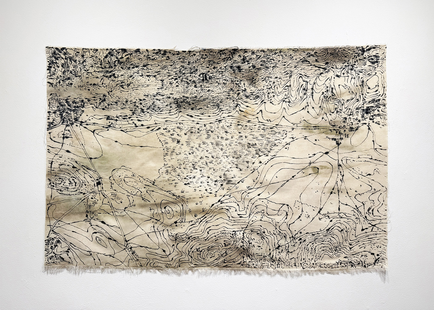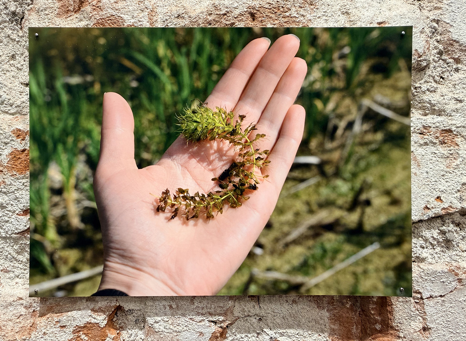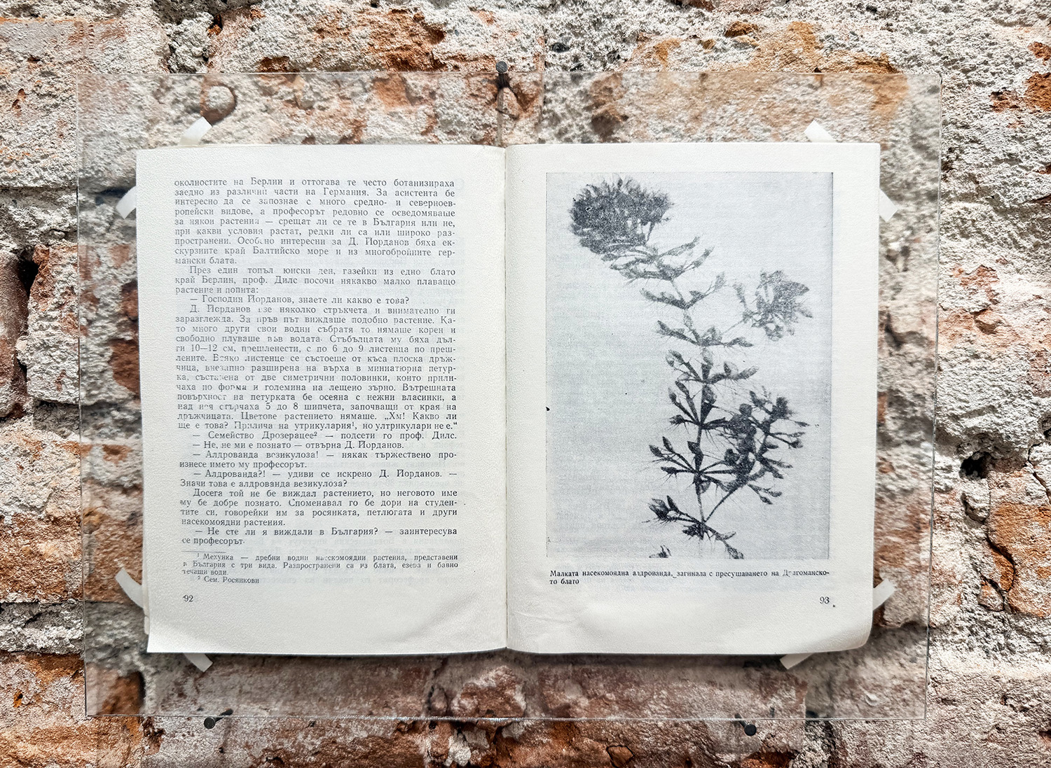 A special place in the exhibition is given to a work based on an old topographic map from the early twentieth century that shows the marsh with its boundaries before it was drained. The artist's interest is drawn to a remarkable plant species inhabiting the marsh—the waterwheel plant Aldrovanda, which is also present visually in the exhibition. The story of this plant's discovery in Bulgaria's flora is engagingly told by Stefan Stanev in the book Stars Fade in the Mountains. Maria begins her study of Aldrovanda from this account. It is a carnivorous plant that has no root and floats freely in the water. Today it is here; tomorrow it is gone. In the winter months it transforms into a more compact state and sinks to the bottom, where it remains until spring, when it resumes its floating form and rises to the water's surface to continue its development. Aldrovanda is extremely vulnerable, and its only known habitat in Bulgaria at the time disappeared when the Dragoman Marsh was drained. In 2008, thanks to the efforts and research of experts from the Balkani Wildlife Society, the species was reintroduced to its original site. The artist finds this intriguing plant, but at her next search she cannot locate it—much like the canvas left on the bottom. In the image of Aldrovanda the metaphor of sinking is concentrated (into the marsh, into the past, into the present, into the subconscious). This aquatic plant, drifting through silty waters—infinitely fragile and vulnerable, yet having evolved remarkable mechanisms for survival—becomes a kind of symbol of disappearance, return, and rediscovery.
