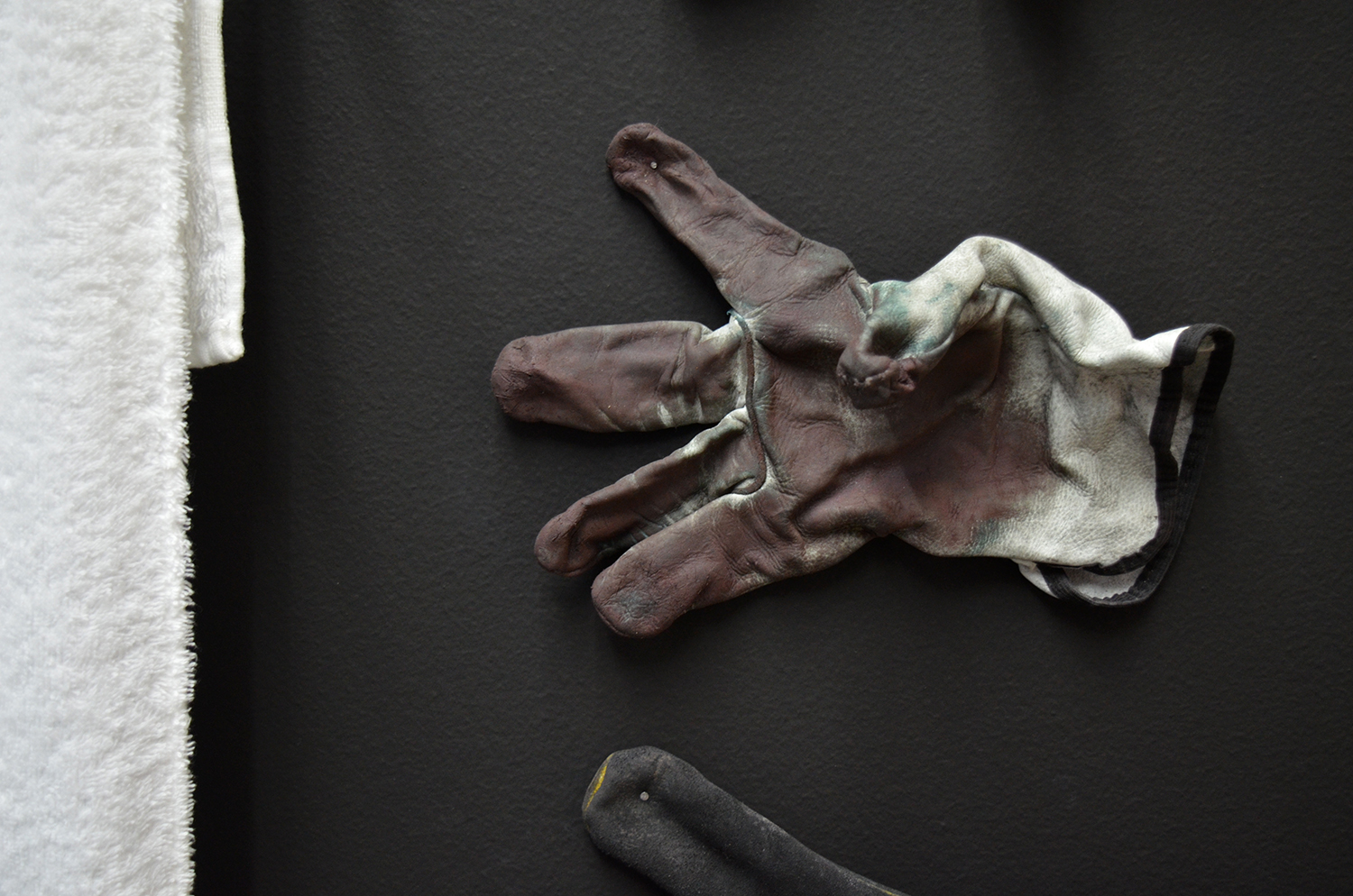 various dimensions towel holder with mirror, towel with embroidery, used gloves 2021 Part of the exhibition “In defence of solid material”, curated by Vesselina Sarieva, Sarieva, Plovdiv, BG 2019 Part of the exhibition “Good mirrors are not cheap”, curated by Chiara Cartuccia, Goethe-Institut Bulgarien