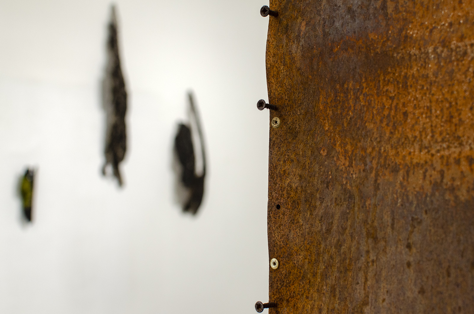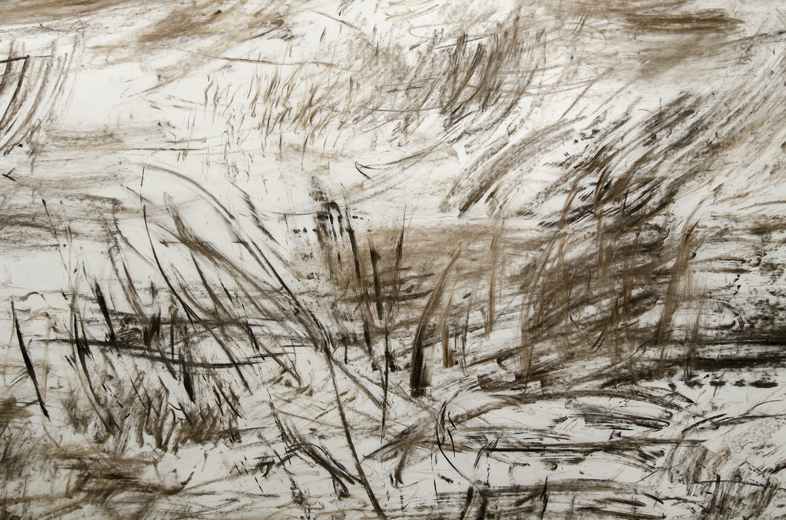 charred wood pieces, a burnt metal door from a bird-watching tower, 600x125 cm drawing made with charred wood collected in 2024 from the Dragoman Marsh.