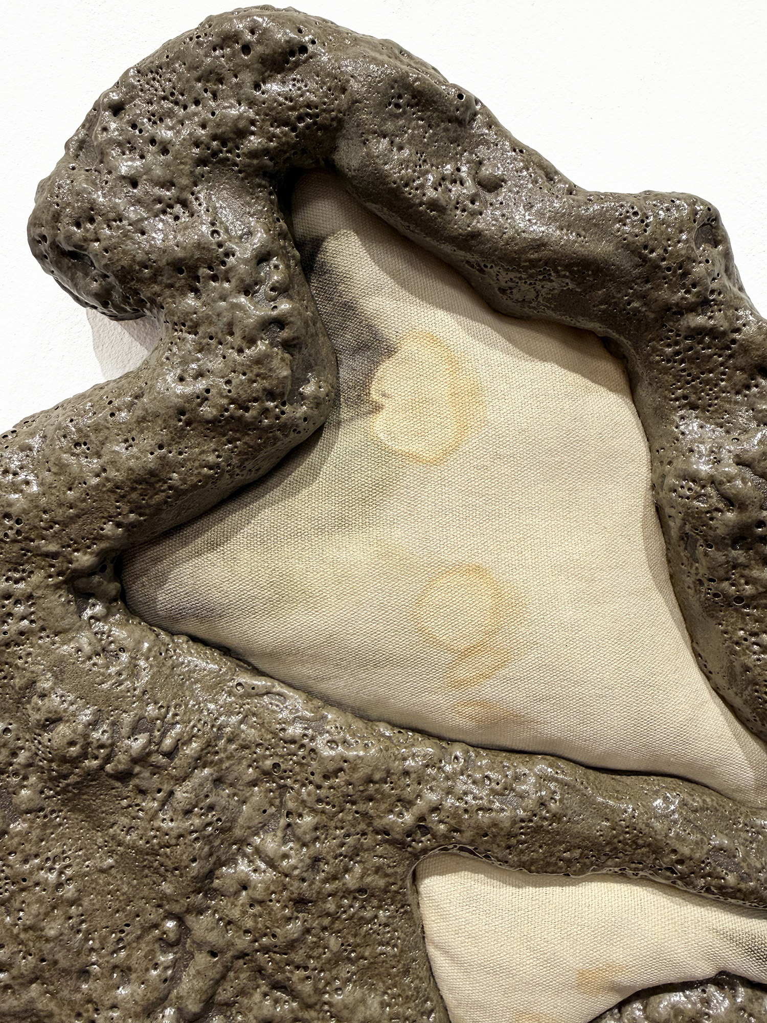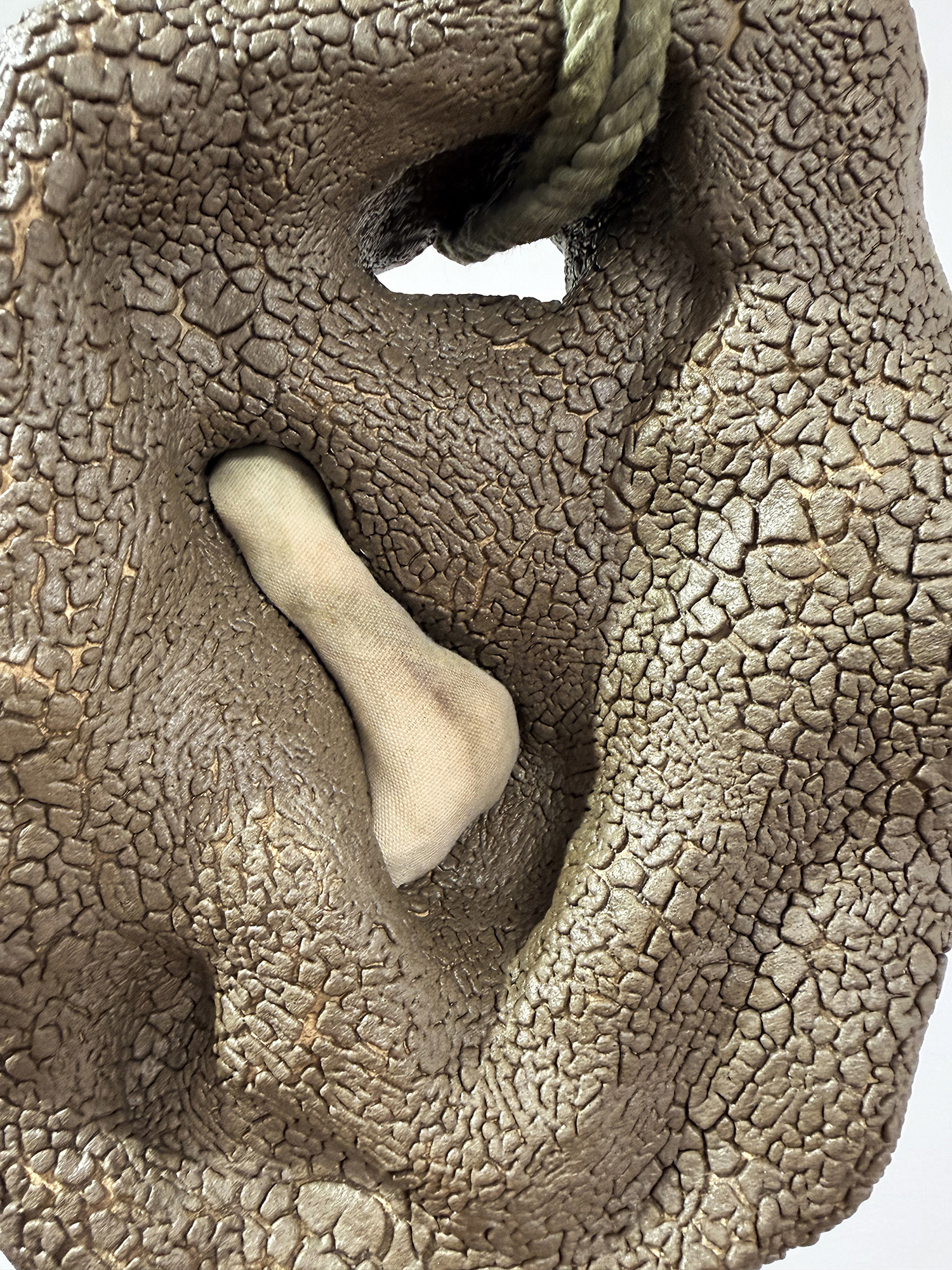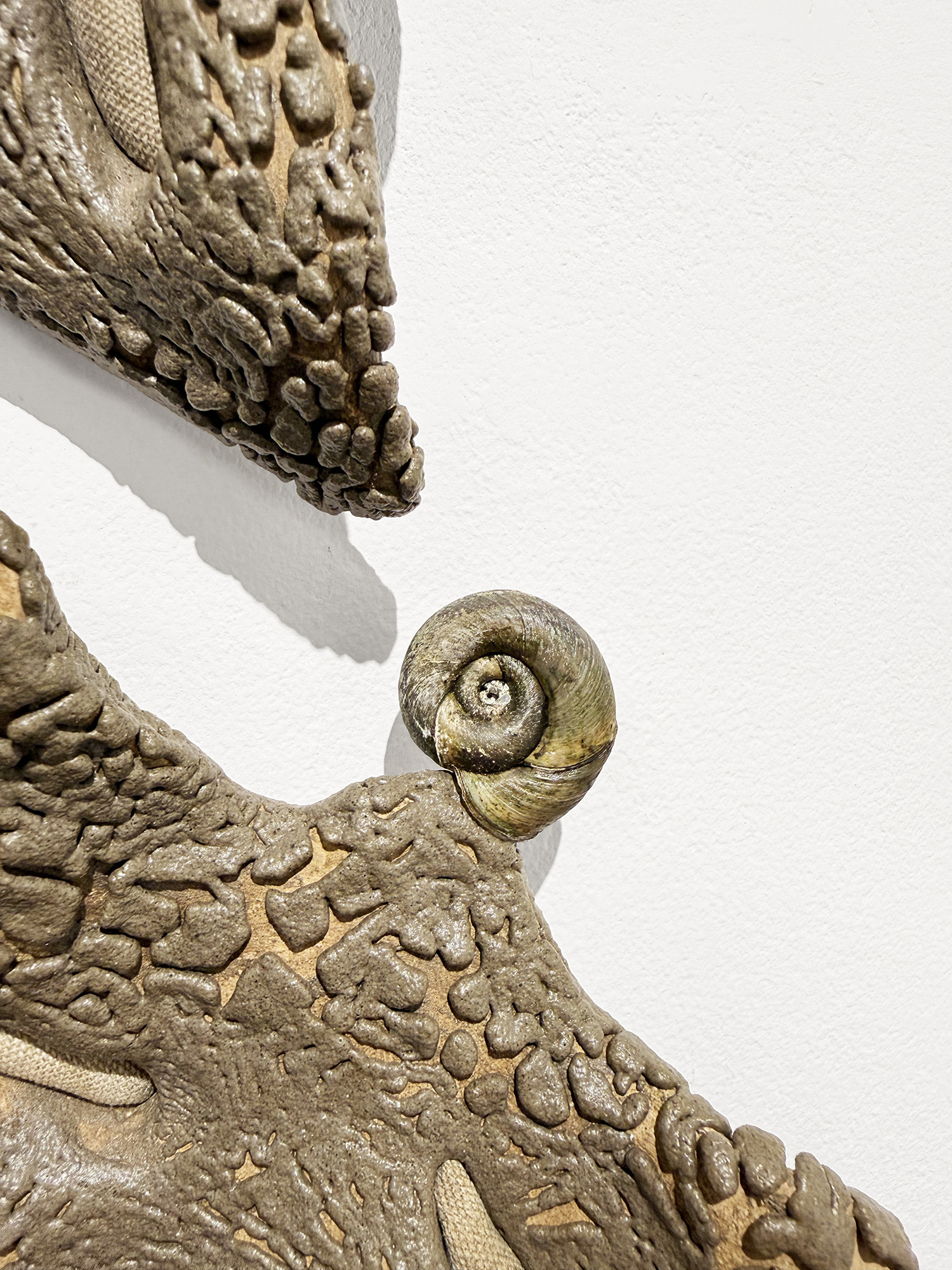 The artist turns her attention to the processes of sinking and surfacing—both as real phenomena in nature and as a metaphor for the human subconscious. In this project Maria presents her newest works, connected to her interest in ceramics. The material carries its own semantics and conjures an image of mud, as if scooped from the bottom of the Dragoman Marsh. The irregular rounded forms of these ceramic pieces, their textures and apertures, summon associations with water, earth, and living organisms—all those microscopic creatures that our eyes cannot catch but without which life would not flourish within this particular ecosystem. Marshes are alive and unpredictable; in them nature pulses by invisible laws, and Maria's works impress this upon us through the harmony of their “naturalness”. Into the openings of the ceramic forms the artist weaves fragments of canvas that was deliberately “swamped” (here the term is used by analogy with “buried”) at the bottom of the Dragoman Marsh and left there for six months.