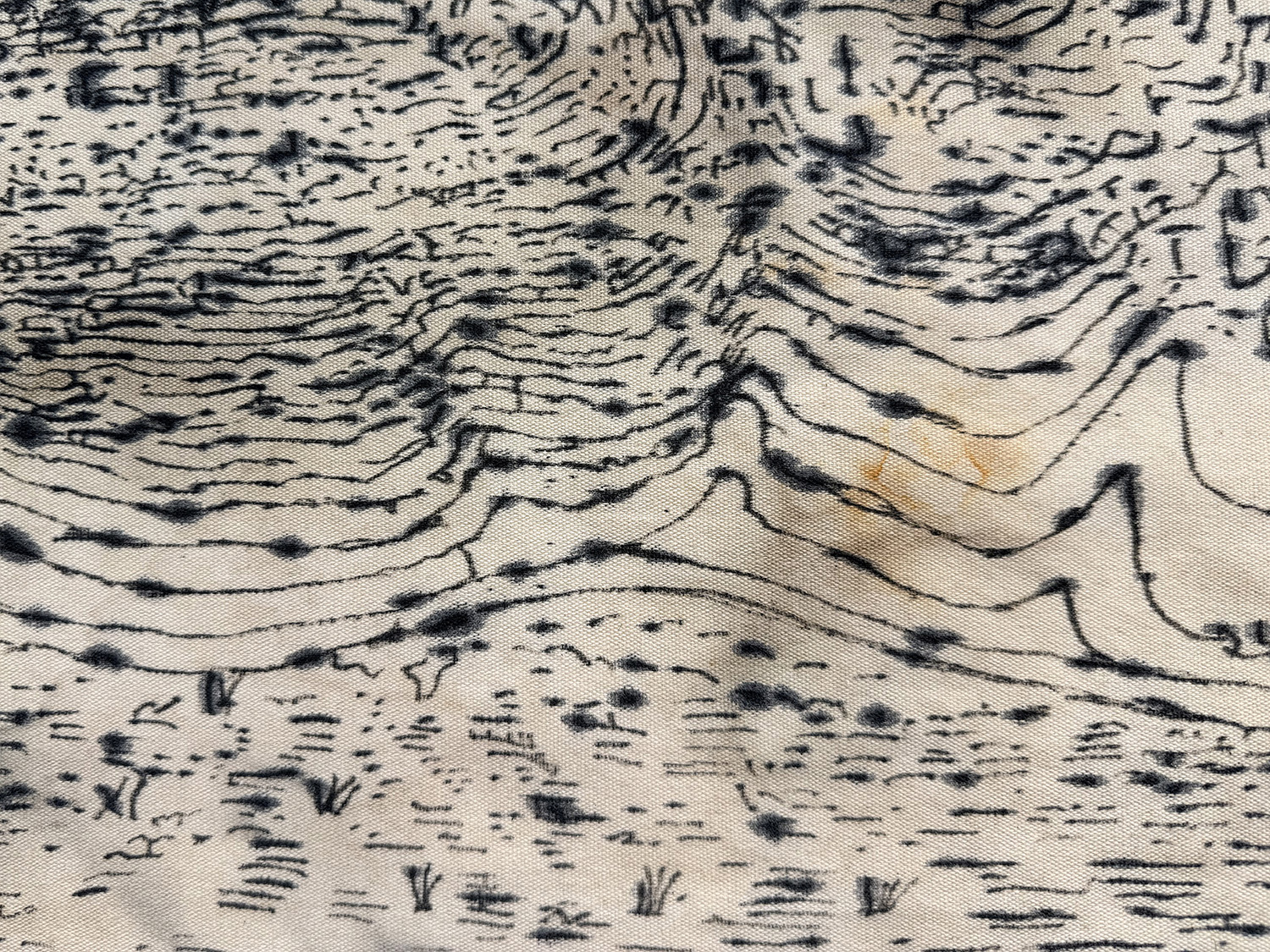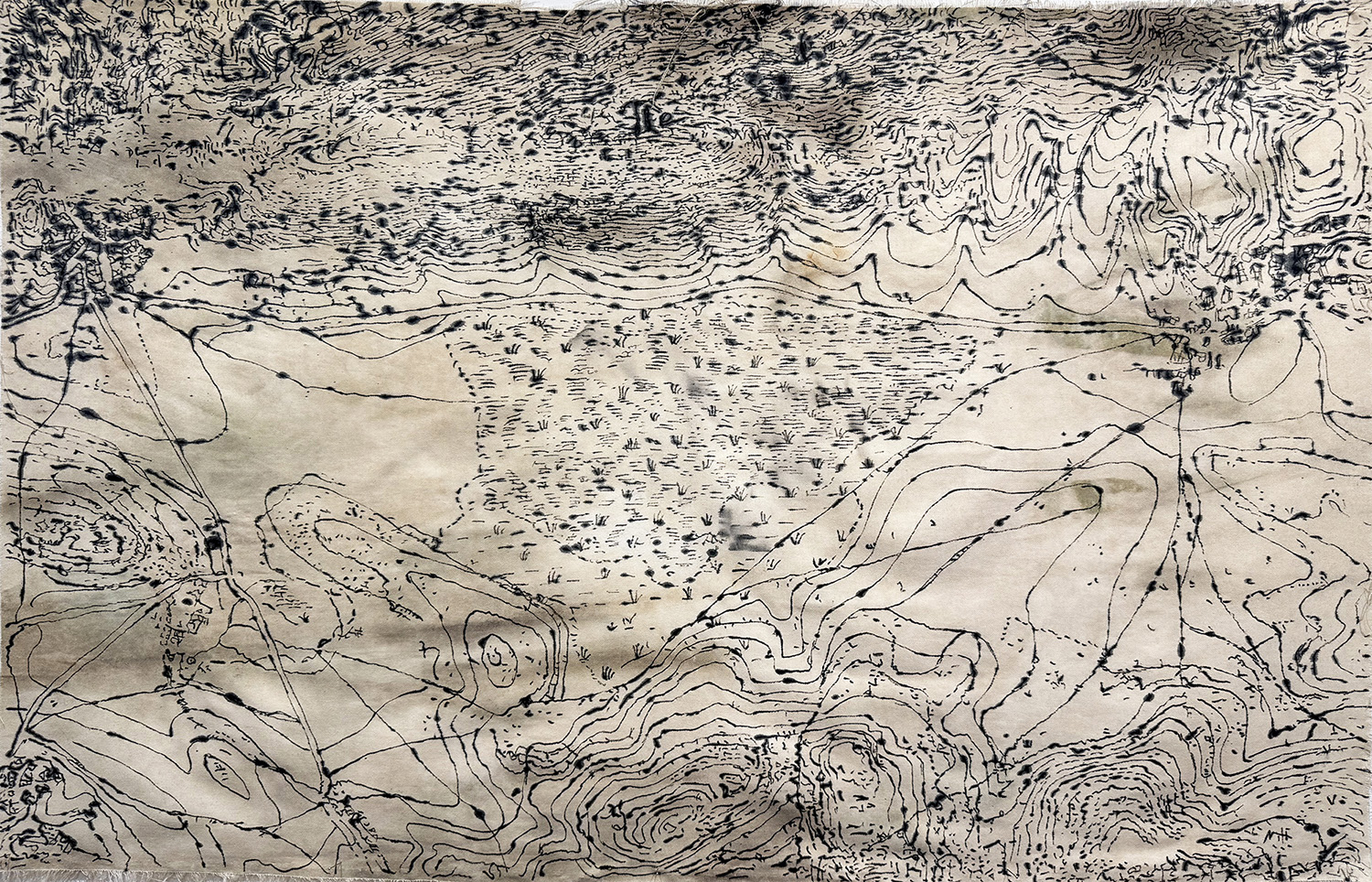 A special place in the exhibition is given to a work based on an old topographic map from the early twentieth century that shows the marsh with its boundaries before it was drained. The artist's interest is drawn to a remarkable plant species inhabiting the marsh—the waterwheel plant Aldrovanda, which is also present visually in the exhibition. The story of this plant's discovery in Bulgaria's flora is engagingly told by Stefan Stanev in the book Stars Fade in the Mountains. Maria begins her study of Aldrovanda from this account. It is a carnivorous plant that has no root and floats freely in the water. Today it is here; tomorrow it is gone. In the winter months it transforms into a more compact state and sinks to the bottom, where it remains until spring, when it resumes its floating form and rises to the water's surface to continue its development. Aldrovanda is extremely vulnerable, and its only known habitat in Bulgaria at the time disappeared when the Dragoman Marsh was drained. In 2008, thanks to the efforts and research of experts from the Balkani Wildlife Society, the species was reintroduced to its original site. The artist finds this intriguing plant, but at her next search she cannot locate it—much like the canvas left on the bottom. In the image of Aldrovanda the metaphor of sinking is concentrated (into the marsh, into the past, into the present, into the subconscious). This aquatic plant, drifting through silty waters—infinitely fragile and vulnerable, yet having evolved remarkable mechanisms for survival—becomes a kind of symbol of disappearance, return, and rediscovery.